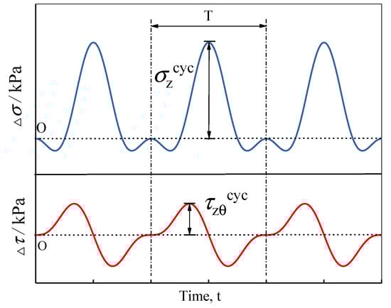 The test apparatus used was the GDS dynamic hollow cylindrical apparatus (DHCA) manufactured by GDS Instruments Ltd., UK. It can independently apply axial force W, torque MT, outer pressure po, and inner pressure pi, and then control all four stress components in the soil element (axial stress σz, radial stress σr, tangential stress σθ, and shear stress ), i.e., the independent control of the magnitudes and directions of all three principal stresses. The apparatus also enables the customization of the cyclic loading waveforms for axial forces and torques. It enables continuous rotation of the principal stress axis and can be used to simulate traffic loading. Cai et al. [] used a hollow cylinder apparatus to apply cyclic stress and shear stress to specimens, demonstrating that this method can simulate traffic loading better.