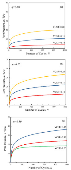 Pore pressure versus number of cycles under different cyclic loading: (a) η = 0.00; (b) η = 0.25; (c) η = 0.50.