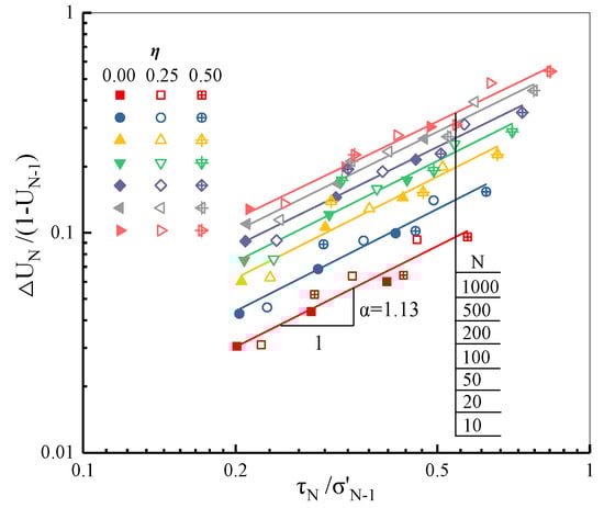 Figure 5 shows the development of pore pressure with cycles N under different loading conditions. As shown in Figure 5, the pore pressure accumulates rapidly in the early stage, slowing down in the later stage and eventually stabilizing. At the same torsional cyclic stress ratio η, the pore pressure accumulates more as the VCSR increases. At the same stress level, the increase in the degree of principal stress rotation also increased the pore pressure accumulation. In other words, the increase in both dynamic stress and the principal stress rotation can lead to an increase in the accumulated pore pressure. The development of pore pressure under cyclic loading is an important aspect of the change in the deformation strength of saturated soils. Dynamic pore pressure is also the key to analyzing the dynamic stability of soils. A correct understanding of the pore pressure development in saturated clay under cyclic loading and a suitable dynamic pore pressure model can be established to better analyze the dynamic characteristics of saturated soft clay. Based on the results of the round-trip triaxial and torsional shear tests, Sherif et al. [] found that the rate of pore pressure growth at the Nth time and the intensity of the dynamic stresses have a linear relationship in double logarithmic coordinates, and the slope of the line does not vary significantly with cycle. As a result, Sherif et al. [] proposed a dynamic pore pressure model for pore pressure growth under cyclic loading, which is given by: