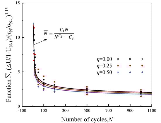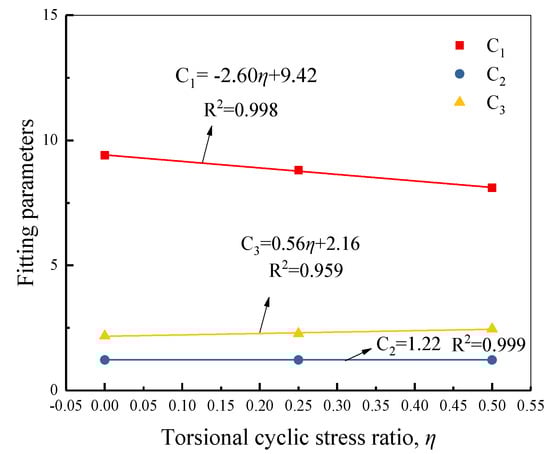 The soil unit under traffic loading is subjected to the continuous principal stress rotation, for which we propose a dynamic pore pressure correction model that considers the continuous principal stress rotation. Figure 6 shows the experimental relationship between the pore pressure parameter and the effective stress ratio , from which it can be seen that the pore pressure parameter increases with the effective stress ratio. In addition, the slope of each straight line shown in the graph is almost identical (α = 1.13). It is also noted in Figure 6 that the increase in pore pressure during cyclic loading is also influenced by the stress cycles. In order to evaluate the effect of stress perimeter on pore pressure, the cyclic effect is introduced, which is derived from the curve equation fitted to the experimental data shown in Figure 7. The data in Figure 7 show that the pore pressure growth decreases with the number of cycles even if the amplitude of the dynamic stress is the same. Figure 8 shows the relationship between the pore pressure model parameters C1, C2, and C3 and the torsional cyclic stress ratio η. The three parameters show a good linear relationship with the torsional cyclic stress ratio η, which can be expressed as follows: