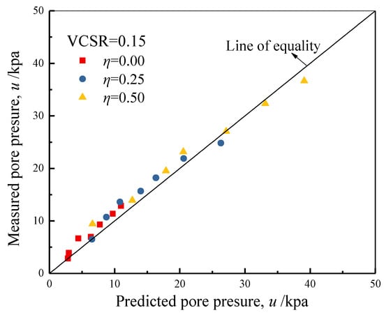 Using the developed pore pressure model Equation (9), the test pore pressure under traffic loading considering the principal stress rotation was simulated. Figure 9 compares the pore pressure values derived from Equation (9) with the data measured from the test under cyclic loading. In this figure, the predicted results are in better agreement with the test results, proving that the dynamic pore pressure model is reasonable.