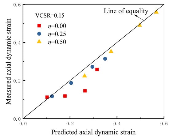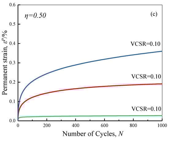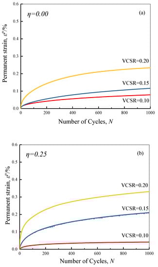 Figure 10 shows the development of the permanent axial strain with loading cycles N under different loading conditions. Similar to the cyclic triaxial test, the permanent strain in the specimen increases rapidly in the early stage, and most of the strain accumulation is completed within a short period. Then, the permanent strain growth rate gradually slows down. For common cyclic triaxial tests, the specimen under a higher VCSR value always has a larger permanent strain that is generated by the disturbance of the test. For the same VCSR, the specimen under a higher η value also produces a higher permanent axial strain This indicates that even if the vertical stress levels are the same, the different rotations of the principal stress axes will still significantly affect the permanent axial strain in soft clay. For example, at η = 0.25, the development of permanent strains in the tests corresponding to VCSR = 0.10, VCSR = 0.15, and VCSR = 0.20 increases in turn. Compared with the nonconsideration of the principal stress rotation, the rotation of the principal stress axis significantly aggravates the axial deformation of soil, and the axial deformation will continue to increase with the principal stress rotation, which indicates that the influence of the principal stress rotation on the soft clay cannot be ignored in the study of traffic loading.