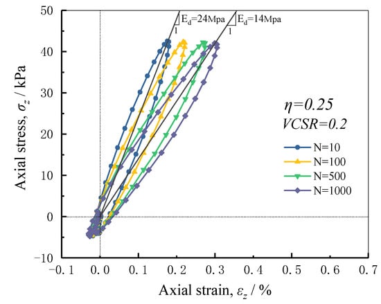 Taking specimen (η = 0.25, VCSR = 0.20) for example, Figure 11 shows a typical stress–strain relationship curve under cyclic traffic loading. In order to eliminate the residual accumulated strain, the center of the hysteresis curve for the 1st, 10th, 100th, 500th, and 1000th cycles has been shifted to the origin. The hysteresis curves are relatively steep in the early loading stage, and the slope of the hysteresis circle gradually decreases with the number of cycles, indicating that there is stiffness degradation in the saturated soft clay under cyclic traffic loading. At the same time, due to the accumulation of pore pressure in the soil under undrained cyclic traffic loading, the permanent strain of the specimen has a positive correlation with cycles, which well reflects the nature of stiffness degradation of soft clay.