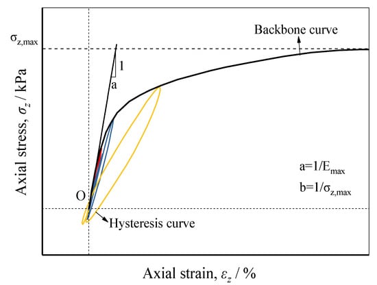 where and denote the dynamic stress amplitude and resilient strain ( is the recoverable portion of axial strain, i.e., the difference between the maximum strain and the strain at the end of the specific loading cycle), respectively, and a and b are test-related parameters, where a is the reciprocal of the maximum resilient modulus and b is the reciprocal of the ultimate dynamic stress of the soil [], as shown in Figure 12.