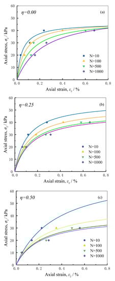 Axial dynamic strain versus number of cycles under different cyclic loading conditions: (a) η = 0.00; (b) η = 0.25; (c) η = 0.50.