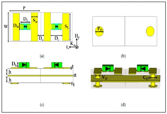 In this study, a combination of two types of unit cell geometries arranged in the same MS reflector were designed. Figure 1a–d shows a typical unit cell design consisting of a front side, back side, profile, and 3D view of two adjacent unit cells. This unit cell is composed of two PCB layers made by the Rogers Company, model RT/Duroid 5880 with εr = 2.2 [21], and three copper layers of 0.5 oz thickness. The unit cell is composed of two vertical stripes in the top layer with each electrical connected to a pad, in conjunction with a varactor diode (used in this study) by a horizontal appropriate microstrip line. The varactor diode, model MAVR–011020–1411 of Macom [19], is used in this MS design due to its extremely low capacitance. The varactor diode is placed on the pad between the strips (see Figure 1 in green), adding variable capacitance Cdiode to the unit cell. The dynamic range of the capacitance is Cdiode max = 0.216 pF to Cdiode min = 0.032 pF for 0–15 V reverse bias voltage, respectively. One of the vertical stripes has the same length as the unit cell width, W (used for the DC ground), while the second strip, SL, has a shorter length by 0.05 mm and is connected through a via to the back side of the PCB for the DC bias circuit. The middle copper layer acts as a metal ground for the unit cell, and it is separated by clearance (CD) from the via, as shown in Figure 1d. To have a symmetrical unit cell design, a mirror unit cell was added, as seen in Figure 1, where polarization- and propagation-instated reduction hits are perpendicular to the surface, as shown in Figure 1a.