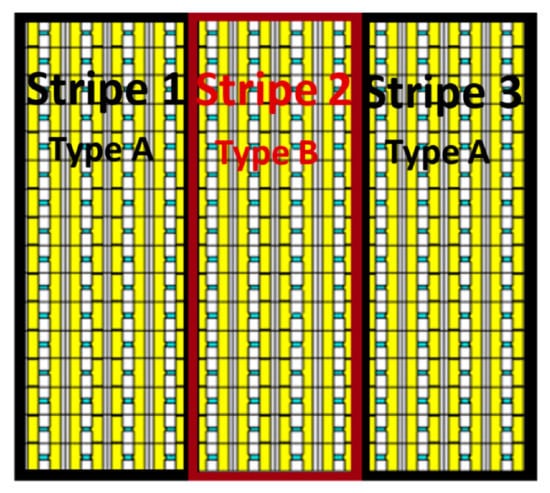 In this study, we propose a new concept referred to as the stripes configuration. The proposed configuration is composed of three stripes (1, 2, and 3) of two types of MS reflectors (Type A and type B) arranged side by side, as can be seen in Figure 2. Each type has a different unit cell design as shown in Table 1. The designed MS has three stripes with each stripe composed of four unit cell columns (Figure 2). Each stripe has a different dielectric substrate thickness, h, yielding a smaller dynamic phase range improving the reflected gain. Stripe one and stripe three are identical stripes with a thickness of h = 0.6 mm. The thickness of stripe two, in the middle, is h = 0.75 mm. Using the 3D electromagnetic simulation software CST, three different unit cell parameters were investigated and optimized for best performance. The final dimensions are summarized in Table 1. Two different MSs for 28 GHz were designed and investigated, based on the unit cells given in Table 1. The first is a typical uniform MS (one stripe) based on a uniform unit cell. The second MS is composed of two types of unit cells, type A and type B, arranged in three stripes, as shown in Figure 2.