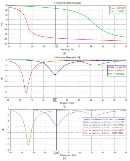The proposed MS reflector was simulated using the TEM plane wave port with CST simulation software [24]. The simulation results of the uniform unit cell, including magnitude and phase reflection as a function of frequency, are shown in Figure 3. The simulations were repeated for three capacitance values: Cdiode min = 0.032 pF (red), Cdiode max = 0.216 pF (green), and Cdiode res (28 GHz). This provided a dynamic reflection phase range of 311°, marked by a continuous black crosser, as shown in Figure 3a. The magnitude of the reflected beam for capacitance is shown in Figure 3b. The maximum loss value for Cdiode res (28 GHz) = 0.0815 pF was 5.5 dB, marked by a continuous black crosser, as shown in Figure 3b. The via was used for the DC bias for the varactor diode. The standard via diameter for manufacturing is 0.25 mm–0.30 mm, which had no effect on the MS’s performance. Figure 3c describes the influence of the via diameter on the resonance frequency and the absorption, where no significant influence was found.