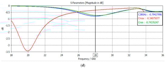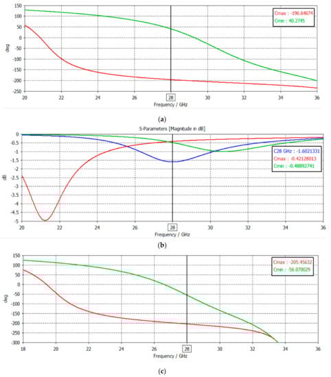 The simulation results of type A and type B unit cell phase reflection and magnitude are shown in Figure 4 as a function of frequency for three capacitance values: Cdiode min = 0.032 pF (green), Cdiode max = 0.216 (red) pF, and the 28 GHz resonance capacitance Cdiode res. Type A provided a dynamic reflection phase range of 236° and type B provided a dynamic reflection phase range of 150°, marked by the dashed black crossers shown in Figure 4a,c, respectively. The maximum loss value of type A Cdiode res (28 GHz) = 0.05 pF was 1.6 dB, and the maximum loss value of type B Cdiode res (28 GHz) = 0.04 pF was 0.8 dB, marked by continuous black crossers in Figure 4b,d, respectively.