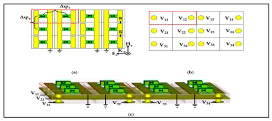 The MS reflector structure, including the DC bias circuit, is shown in Figure 5. The MS structure and the simplicity of DC biasing reduces the complexity and the absorption of the unit cell (Figure 3 and Figure 4). The via and the clearance add losses to the unit cell due to the need to provide a DC bias to each varactor. The stripes of the unit cells are used as a DC ground for the varactors in one stripe column, eliminating the need for an additional via in each unit cell. The shorter strip is used for supplying the DC bias through a via, enabling each MS unit cell to be independently biased. Figure 5 describes the MS structure including the DC bias circuit where ∆ϕx and ∆ϕy are the reflected phase differences between two adjacent unit cells in X and Y, respectively.