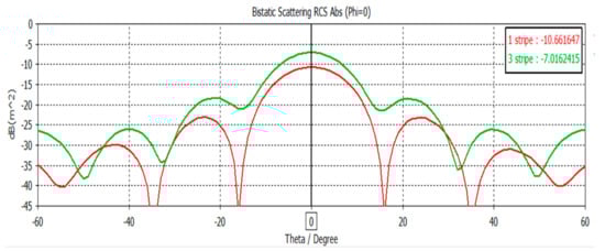 Beam steering far-field radar cross section (RCS) results at 28 GHz with the three-stripe configuration (green) vs. the one-stripe configuration (red). Steering angle simulations results of 0°.