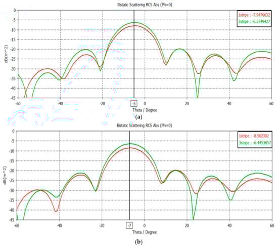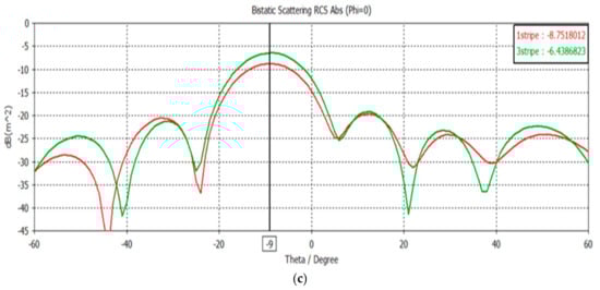 Beam steering far-field radar cross section (RCS) results at 28 GHz in the three-stripe configuration (green) vs. the one-stripe configuration (red). (a) Steering angle simulation results of 5°. (b) Steering angle simulation results of 7°. (c) Steering angle simulation results of 9°.