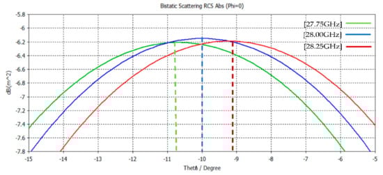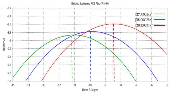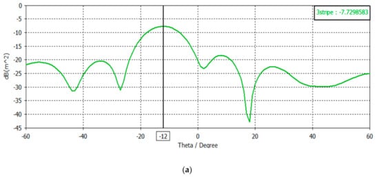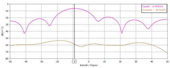 The co-polarization and cross polarization properties of the proposed three-stripe MS was investigated for the case of 9° beam steering. The simulation results show that most of the transmitted power was reflected in the co-polarization. The cross polarization was below 50 dB, referring to the co-polarization, as seen in Figure 8.