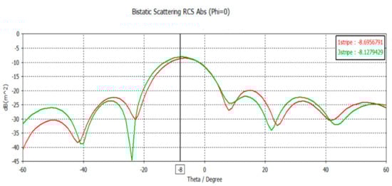 Beam steering far-field radar cross section (RCS) results at 28 GHz in the three-stripe (green) vs. one-stripe configuration (red). Steering angle simulation results of 8°.