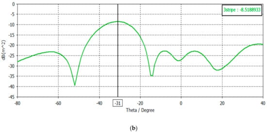Beam steering far-field radar cross section (RCS) results at 28 GHz in the three-stripe configuration. (a) Steering angle simulation results of 12°. (b) Steering angle simulation results of 31°.