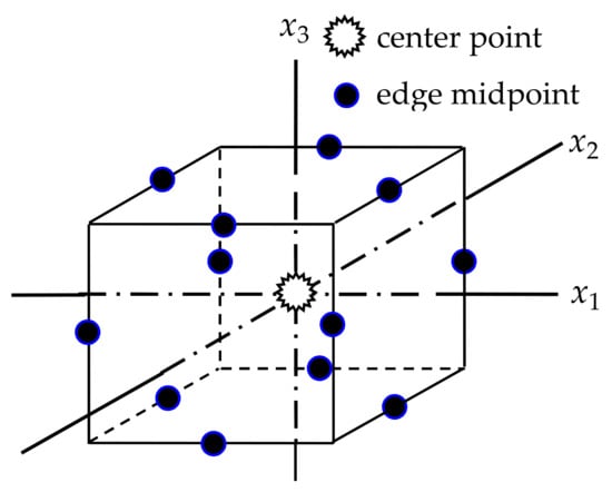 According to the Box-Behnken sampling, when the number of variables is greater than 3, the required samples are obtained by the combination of two-level factorial design and incomplete block design []. Similarly, the permutations and combinations of 12 variables are obtained as shown in Equation (25) by Box-Behnken sampling. Meanwhile, 192 edge midpoints and 12 center points are obtained shown in Appendix B.