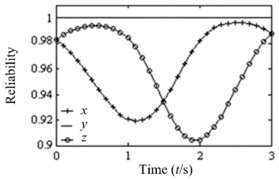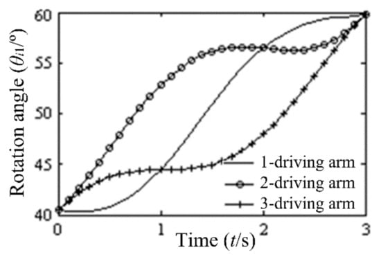 Figure 4 shows the change of the rotation angles of the three driving arms during the movement. When and , the results of the kinematic reliability in the x, y and z directions are as shown in Figure 5. The kinematic reliability of the mechanism in the y-direction is observed to be larger than that in the x and z directions corresponding to the given coordinate system and motion trajectory.