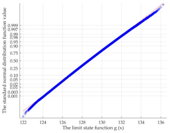 The limit state function g(x) is shown in Appendix Equation (A1). As shown in Figure 6, the frequency histogram of g(x) is obtained using the Monte Carlo method based on Equation (38). The g(x) distribution diagram is shown in Figure 7. The distribution is noted as linear indicating that g(x) has a normal distribution.