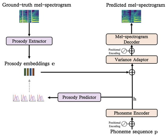 Recently, non-autoregressive TTS models such as FastSpeech2 [] have become popular due to their fast inference speed and stability. Compared with the original FastSpeech [], FastSpeech2 is optimized to minimize the mean square error (MSE) between the predicted and the ground-truth mel-spectrograms, instead of applying a teacher–student training. Moreover, the duration target is not extracted from the attention map of an autoregressive teacher model but the forced alignment of speech and text. Additionally, ref. [] condition the prediction of mel-spectrogram on the variance information such as pitch and energy with a variance adaptor. The adaptor is trained to predict the variance information with an MSE loss .