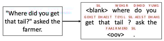 Figure 2 illustrates an example of text normalization. Here, we transformed the “did” and “asked” to their prototype “do” and “ask”. Quotation marks were removed, and the “farmer” was treated as an OOV. We added a blank token to the word sequence to align it with the silence at the beginning of the phoneme sequence.
