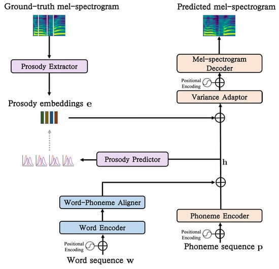 In this work, we utilized both words and phonemes as the inputs. Thus, we introduced a word encoder and a word-phoneme aligner in our TTS system, whose architecture is shown in Figure 3. The word encoder takes the normalized word sequence as input and generates a hidden state sequence . Then, each hidden state in is duplicated according to the number of phonemes aligned with the corresponding word. Accordingly, the output has the same sequence length as the phoneme encoder output . Then, we concatenated and together to obtain , which was then used for phone-level prosody prediction. Generally, the final hidden states were obtained by encoding the word and phoneme sequence, that is