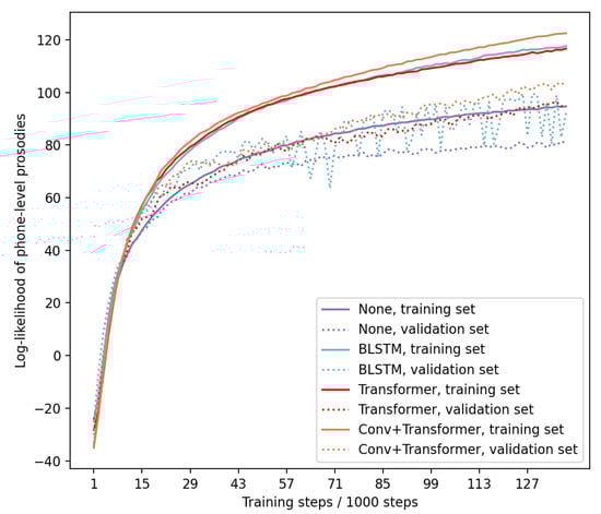 Figure 4 illustrates the log-likelihood curves of phone-level prosodies with various word encoder architectures. In both the training and validation sets, we can observe that all the systems with acoustic word encoders outperform the baseline system that does not use word information. Moreover, the Conv+Transformer achieves the best performance out of the three common architectures. This is reasonable because it is already known that the Transformer has better capabilities than a simple LSTM [] in sequence modeling, and the convolutional layer directly considers the adjacent word contexts. Therefore, we used Conv+Transformer in all the following experiments for the best performance.