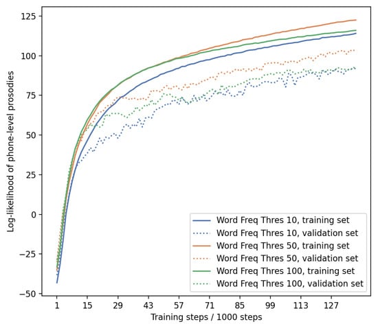 We also plotted the log-likelihood curves of phone-level prosodies with various word frequency thresholds. As is depicted in Figure 5, we saw the best performance at the threshold of 50. When the threshold is too large, fewer words are considered, and the system performance is harmed. However, when the threshold is too small, many low-frequency words are included in the vocabulary. These acoustic word embeddings are only trained with very limited data, which also leads to a decline in system performance.