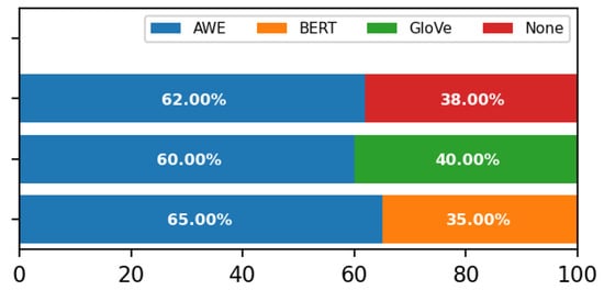 An AB preference subjective listening test was carried out in terms of naturalness (The audio examples are available at https://cpdu.github.io/acoustic_word_embedding (accessed on 11 August 2021)). Ten listeners with no prior experience in TTS participated in this test. Ten pairs of synthetic speeches were provided to the participant in one trial to select the better one of each pair. Each pair consists of one speech randomly selected from 50 AWE synthetics and the other randomly chosen from 50 BERT/GloVe/None synthetics. Each participant went through three trials (BERT, GloVe, and None) and made 30 judgments in total. Figure 6 demonstrates the subjective results. As expected, the proposed system with acoustic word embeddings not only outperformed the baseline that does not use any word information directly, but also outperforms the systems that use linguistic word embeddings.