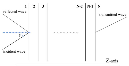 In general, the fiber sensor based on the SPR can be considered as an N-layer model [32,33,34]. To simplify the model, all the layers are assumed to be uniform, isotropic, non-magnetic, and stacked along the z-axis, as shown in Figure 2. Here, we use the matrix method to obtain the expression for the reflected light intensity of p-polarized incident light.