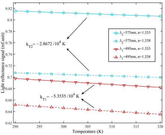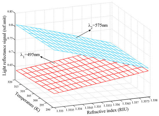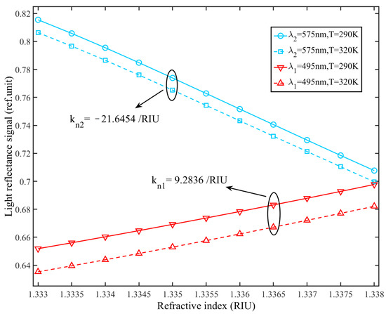 In order to investigate the feasibility of the dual-wavelength method for the simultaneous measurement of the changes of RI and temperature, a theoretical calculation and numerical analysis are conducted to quantify the output signal, i.e., light intensity, of a fiber-optic SPR sensor with different temperature and RI. In our simulation, the core of a multimode fiber is coated with gold film. The thickness of the gold sensor film is assumed to be 50 nm. The numerical aperture (NA) of the optical fiber is set to 0.36. Temperature variation is in the range of 290–320 K and the interval of variation of the RI is set to 1.333–1.338 RIU. The two characteristic wavelengths nm and nm are sought for the evaluation of temperature effect and RI on the fiber-optic SPR sensor. The dependence of output signal on temperature and RI is analyzed based on the model analysis in Section 2. Hence, the theoretical analysis and numerical calculation are carried out to quantitative analysis of the variations of temperature and RI simultaneously. The dependence of reflectance signals on RI and temperature are simulated at the wavelengths nm and nm, as shown in Figure 5. It is obvious that the reflectance signals and are linear with both RI and temperature. For example, the reflectance signal increases linearly with RI at a temperature of 300 K, while the linear decrease of the signal is with RI at the temperature of 300 K. Besides, the absolute slope of is larger than that of , which reveals that the change of reflectance signal at is faster than to RI variation. In other words, the constructed fiber-optic SPR sensor is more sensitive to RI at the . Meanwhile, another feature is that the linear variation of the reflectance signals with temperature is less significant than RI. It demonstrates that the reflectance signal is less sensitive to temperature. The variation of the output signal mainly depends on the change of RI. In summary, the relationship between the output signal change versus RI and temperature variation is approximately linear with different slopes depending upon the light wavelength used in the measurement.