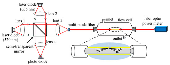 Based on the above-mentioned dual-wavelength method, the approach can be directly applied to the conventional fiber-optic SPR sensor. A proof-of-concept experiment is carried out with a typical transmission-based fiber-optic SPR sensor. The schematic of the transmission-based fiber-optic SPR is shown in Figure 8. Two laser diodes with the center wavelengths of 520 nm and 635 nm light up in turns. The light beams interflow into the two exiting directions through a semi-permeable mirror. One direction of the light is directly recorded by a photoelectric detector as the reference to eliminate the influence caused by the fluctuation of light source. The other one is the detecting light coupled into the optical fiber with the lens 3. The light passes through the SPR sensing probe portion and is detected with a fiber-optic power meter (PM20A, Thorlabs). A step index multimode fiber (core: 200 μm, 0.37NA) is used as the light transmission medium with cladding of 10 mm length removed. Then, the unclad fiber core is coated with gold film of a thickness of 50 nm using vacuum magnetic sputtering rotary technique.