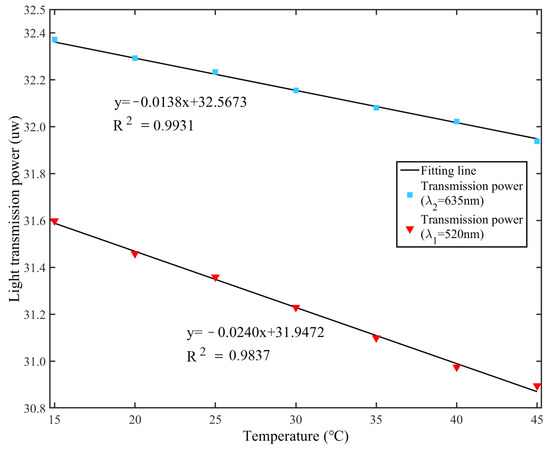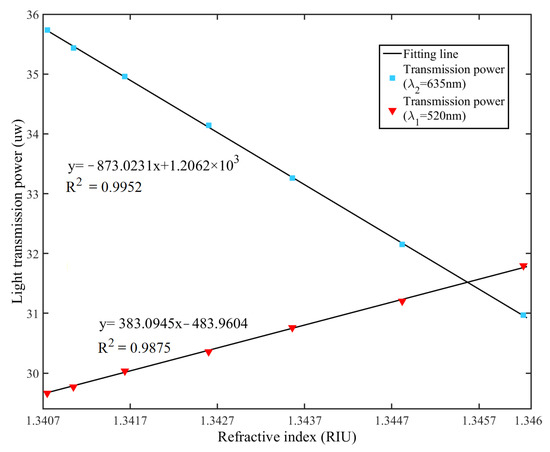 where and are the output changes of the two defined signals. and represent the RI variation and temperature change, respectively. K is the sensitivity matrix, taking into account the cross-sensitivity between the changes of RI and temperature. The sensitivity matrix K is composed of the linear fitting coefficients between the output signals versus the RI and temperature as shown in Figure 6 and Figure 7. However, the changes of RI and temperature are invisible in an actual sensing case of measuring the resonance spectrum to detect the variations of RI and temperature. Therefore, by the inverse matrix of K and measuring the defined output signals at the dual wavelengths, the changes of RI and temperature can be calculated simultaneously as: