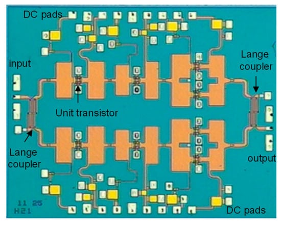 - Wang, W.; Guo, F.; Chen, T.; Wang, K. 24.8 A W-band power amplifier with distributed common-source GaN HEMT and 4-Way Wilkinson-Lange combiner achieving 6W output power and 18% PAE at 95GHz. In Proceedings of the 2020 IEEE International Solid-State Circuits Conference (ISSCC), San Francisco, CA, USA, 16–20 February 2020; pp. 376–378. [Google Scholar] [CrossRef]