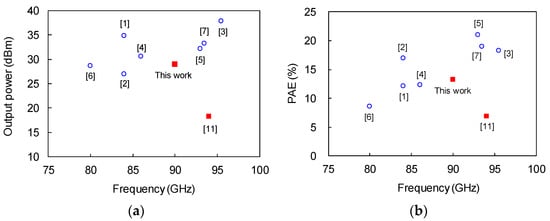 - Niida, Y.; Kamada, Y.; Ohki, T.; Ozaki, S.; Makiyama, K.; Minoura, Y.; Okamoto, N.; Sato, M.; Joshin, K.; Watanabe, K. 3.6 W/mm high power density W-band InAlGaN/GaN HEMT MMIC power amplifier. In Proceedings of the 2016 IEEE Topical Conference on Power Amplifiers for Wireless and Radio Applications (PAWR), Austin, TX, USA, 24–27 February 2016; pp. 24–26. [Google Scholar] [CrossRef]