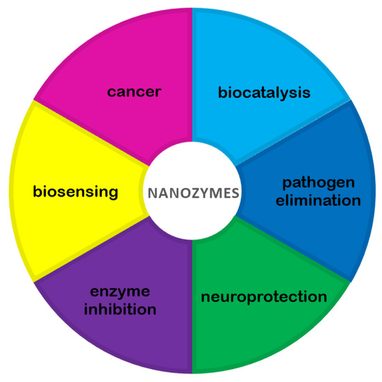Since natural enzymes are proteins, their production and storage are difficult and expensive. Their instability during transfer, modification, and, very often, incompatibility with desired activity conditions limits their use. In addition, there are more and more new needs related to the development of medical knowledge. Meanwhile, designing ab initio a new protein structure that would meet the expected steric and catalytic requirements is beyond the possibilities of modern science. After systematically examining the structure-function relationship of natural enzymes, researchers hypothesized that the rational assembly of functional atoms or molecules could generate similar catalytic activities on enzyme substrates and represent a self-assembled system that mimics the enzyme [1,2,3]. Recent advances in nanotechnology have given rise to developments in this direction and have allowed scientists’ access to an ever-evolving set of artificial enzymes. The nanozyme concept has revolutionized our basic understanding of biology and chemistry, facilitating many applications in the fields of biodetection, biology, and medicine (Figure 1) [4,5,6]. Nanoenzymes have also found numerous applications as catalysts for chemical reactions in the industry [7], wastewater treatment [8], diagnostics [9,10], and others [11].