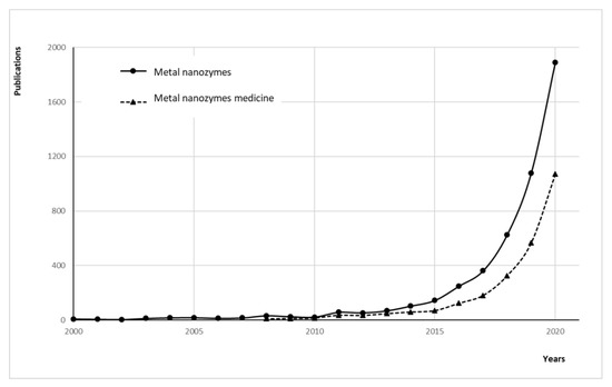Studies of activities mimicking the enzymes of catalytic nanoparticles based on metals and their oxides gain popularity. The graph denotes the number of publications on ‘metal nanozymes’ and ‘metal nanozymes medicine’ cited in Google Scholar by year.