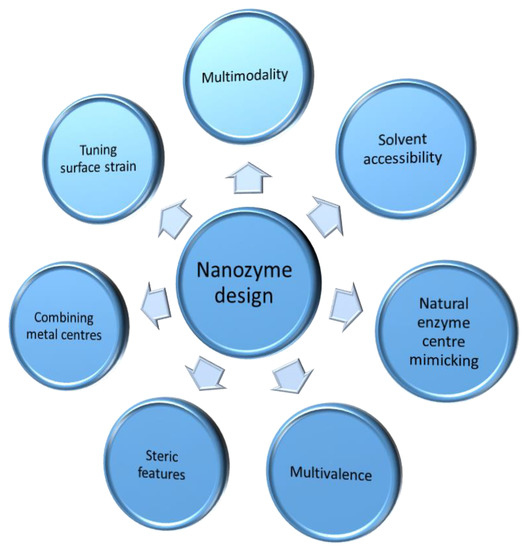 The oxidation state of the metal is a decisive factor influencing the nanozyme activity, as shown in the research of Wang et al. [92]. The authors obtained the porous LaNiO3 nanocubes. The 3+ oxidation state of Ni was shown to be superior to Ni0 and Ni2+ for the nanozymes’ catalytic activities. Specifically, the peroxidase-mimicking activity of the porous LaNiO3 nanocubes with Ni3+ was, respectively, about 58-fold and 22-fold higher than that of NiO with Ni2+ and Ni nanoparticles with Ni0. The oxidation state was very important for cerium oxides’ [93,94] and iron oxides’ [95] enzyme mimicking activities.