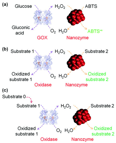 Nanozymes can oxidize a variety of chromogenic substrates, such as (e.g., TMB), 2,2′-azino-bis(3-ethylbenzthiazoline-6-sulfonic acid) (ABTS), 3,3′-diaminobenzidine (DAB), and o-phenylenediamine dihydrochloride (OPD)) in the presence of hydrogen peroxide (H2O2) and produce a distinguishable color. The analytical determination of hydrogen peroxide is of considerable importance for medical diagnosis because H2O2 is formed as an intermediate product in a large number of important detection processes (Equations (3) and (4), Figure 5). Nanozymes can easily replace peroxidase in conventional assays, often extending the field of application of tests by, e.g., a larger pH range. This makes them interesting for the investigation of combined multienzyme assays with oxidases that require a narrower pH range for their optimum activity, as shown for the glucose/glucose oxidase catalytic test [141].