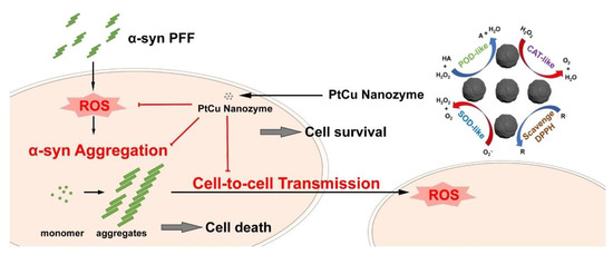 Parkinson’s disease (PD) is the second most common neurodegenerative disorder characterized by misfolded accumulation of α-synuclein (α-syn) [170]. New evidence suggests that oxidative stress is an inevitable pathogenesis factor contributing to the prion-like spread of protein damage [171,172]. For example, paraquat can induce oxidative stress in vivo and in vitro, significantly leading to increased spread of α-syn [171,173,174]. Pathological α-syn has been shown to increase ROS by facilitating the spread of α-syn and causing severe neurodegeneration and behavioral deficits in vivo [175]. At the same time, inhibitors of the NOS-related pathway can significantly prevent α-syn-induced pathogenesis [175], indicating that reducing the level of oxidative stress may be an effective means of counteracting the pathological spread of α-syn in PD. Therefore, experiments on metal-based nanozymes having antioxidative action [176], consisting of platinum and copper (called bimetallic PtCu nanoalloys), showed that the nanozymes could be applied in the treatment for PD due to their antioxidative potential. It was shown that the antioxidative action of nanozymes could prevent the spread of misfolded alpha-synuclein by breaking the positive feedback loop between the accumulation of misfolded alpha-synuclein and the formation of free radicals (Figure 6).