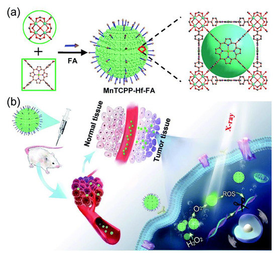 Metal-based and metal-organic-based nanozymes are not the only ones applied for cancer diagnosis. Wang et al. underline that early cancer diagnosis is the key to improving patient survival rate [220] and point out that metal-organic frameworks (MOFs) consist of infinite crystalline lattices with metal clusters and organic linkers may provide opportunities for detection of cancer cells which has remained unknown. They reported the successful use of Fe-MIL-101 MOF with intrinsic peroxidase-like to detect cancer cells by conjugating folic acid onto Fe-MIL-101 without any surface modification. Furthermore, the authors found that the Fe-MIL-101-FA bound selectively to the target cells (human cervical carcinoma cells (Hela), colon adenocarcinoma cells (HT-29), and human mouth epidermal carcinoma cells (KB)) through the interaction between FA and folate receptor. Correspondingly, Chen et al. used MOF as an exemplary model of oxygen catalyzer because of their rich catalytic site and sensitizing effect due to the presence of radiosensitizer (high-Z element Hf) in their structural array [221] (Figure 7). The authors designed a folic acid-modified enzyme-like hafnium-based manganoporphyrin metal-organic framework nanoparticles (MnTCPP-Hf-FA MOF NPs) to overcome hypoxia-induced radioresistance and prevent a postoperative recurrence. The MOF NPs they proposed increased radiotherapy’s therapeutic efficiency and significantly decreased the risk of local tumor recurrence inside a solid tumor with an inadequate oxygen supply. In vivo experiments revealed that the MnTCPP-Hf-FA MOF NPs could effectively inhibit melanoma growth and prevent tumor postoperative recurrence with only one X-ray irradiation after intravenous injection.