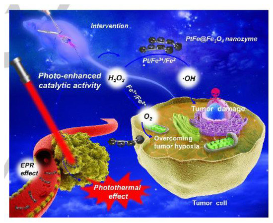 Zhang, Liu et al. [223] constructed a nanozyme with dual enzyme-like activities (PtFe@Fe3O4) for highly efficient tumor catalytic therapy in response to the TME, which is generally known to feature unique characteristics such as the mildly acidic nature, hypoxia, and overproduced hydrogen peroxide (H2O2). Serving as an H2O2-responsive nanozyme, PtFe@Fe3O4 exhibited both intrinsic POD-like and CAT-like activities under acidic conditions. On the other hand, due to the reduced H2O2 concentration in TME, the effect of single-nanozyme-based catalytic therapy is not competent enough compared with combination therapy. The authors have shown that it is possible to achieve efficient deep pancreatic cancer therapy by combining photothermal effects. The catalytic activities of PtFe@Fe3O4 and their therapeutic effect were significantly enhanced under the irradiation of the near-infrared (NIR) laser. At the same time, under light irradiation, nanocatalysts could promote ROS production by direct electron transfer and photoenhanced Fenton reaction [223], (Figure 8). Furthermore, they presented that metal/metal oxide nanomaterials with excellent dual enzyme-like activities can provide a new perspective for the design of nanomedicines and achieve the balanced combination of tumor catalytic therapy and PTT.