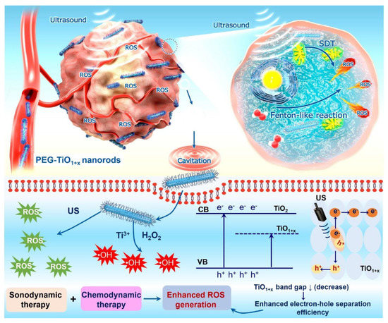 - Wang, X.; Zhong, X.; Bai, L.; Xu, J.; Gong, F.; Dong, Z.; Yang, Z.; Zeng, Z.; Liu, Z.; Cheng, L. Ultrafine Titanium Monoxide (TiO1+x) Nanorods for Enhanced Sonodynamic Therapy. J. Am. Chem. Soc. 2020, 142, 6527–6537. [Google Scholar] [CrossRef] [PubMed]