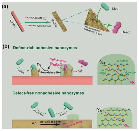 - Cao, F.; Zhang, L.; Wang, H.; You, Y.; Wang, Y.; Gao, N.; Ren, J.; Qu, X. Defect-Rich Adhesive Nanozymes as Efficient Antibiotics for Enhanced Bacterial Inhibition. Angew. Chem. Int. Ed. 2019, 58, 16236–16242. [Google Scholar] [CrossRef]