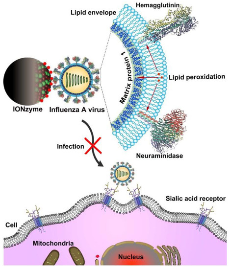 - Qin, T.; Ma, R.; Yin, Y.; Miao, X.; Chen, S.; Fan, K.; Xi, J.; Liu, Q.; Gu, Y.; Yin, Y. Catalytic Inactivation of Influenza Virus by Iron Oxide Nanozyme. Theranostics 2019, 9, 6920. [Google Scholar] [CrossRef] [PubMed]