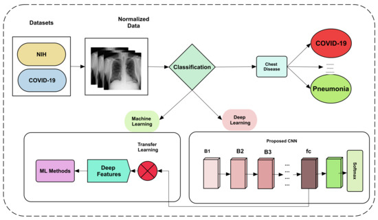 In this study, a framework is proposed for the detection of chest diseases, including COVID-19. First, we train our proposed 32-layer CNN and classify the chest diseases using soft-max activations. After that, transfer learning is applied on fully-connected layer of trained CNN. It extracted deep features that were fed to ML classification methods. We then perform 10-fold and 5-fold validation on best performed of the seven machine learning classifiers. The proposed framework in its first stage takes an image as an input and subsequently applies preprocessing to normalize the data. The processing of the proposed framework with primary steps is shown in Figure 1.
