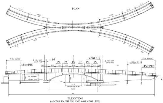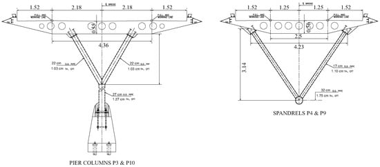 The concrete mixture for the deck was designed according to the New Jersey Department of Transportation (NJDOT) specifications for Class A High-Performance Concrete (HPC) []. The average 28-day compressive strength from cylinder tests was 51 and 59 MPa for the main span and the legs, respectively []. The Young’s modulus was 37.5 GPa []. The arch, piers and spandrels are made of round hollow structural steel (HSS) with a minimum yield strength of 345 MPa and a minimum ultimate strength of 483 MPa, in conformity to ASTM A847-05. All the pipes are designated as CFT (concrete filled tubes) with Yoloy weathering steel type.