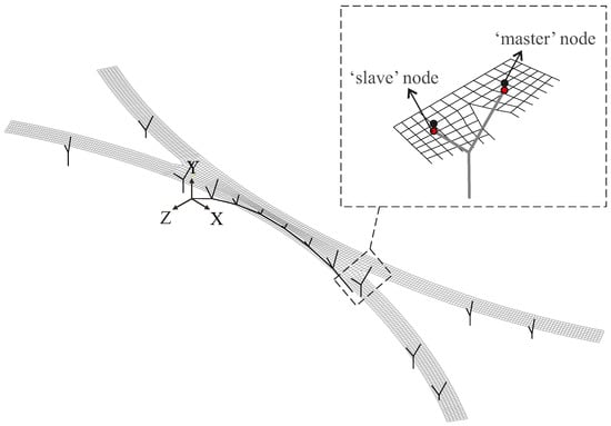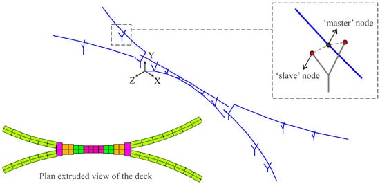 As can be noticed in Figure 5, the deck and pier nodes are not connected by beam elements, but by rigid links that constrain the six degrees of freedom of a removed (“slave”) node to the ones of a retained (“master”) node. For the case at study, the retained node is the deck node at the pier or spandrel locations and the removed nodes are the two upper nodes of every Y-shaped pier and spandrel. The six degrees of freedom of the removed nodes are all constrained in this way, and no independent equilibrium equation is written for them. The bases of the piers and of the arch are fixed, while the boundary conditions at the four abutments are 3D hinges. The model was preliminary validated by comparing the results of the vertical reactions due to self-weight (6902.50 kN) to the weight value computed manually (6904.72 kN).