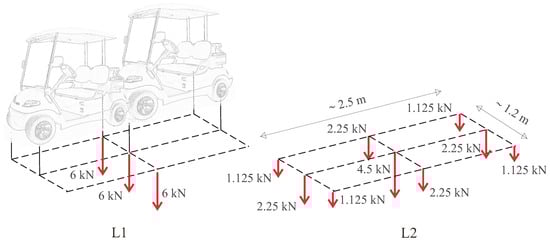 The two static on-site tests (moving golf carts and static trucks) described in Section 2.5 are numerically simulated through the two FE models. In order to obtain moment influence lines to be compared with those experimentally measured, a resultant load of 18 kN, representing the total weight of four golf carts, was applied at different positions along the footbridge length. The load was differently distributed depending on the type of FE model. In the B model, the moving static load is applied as a single force of 18 kN concentrated on a deck node. In the S model, two different load distributions were tested (Figure 7):