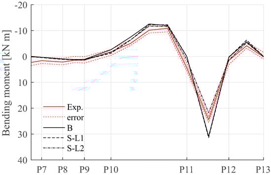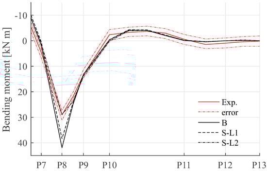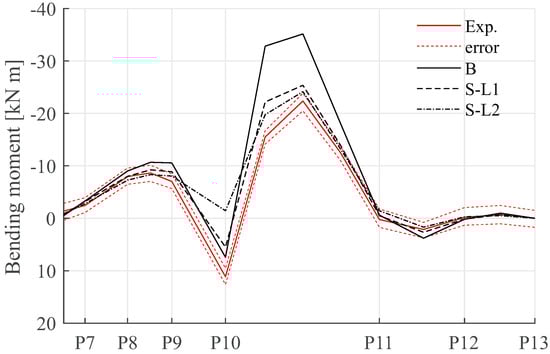 The S model with L2, with a more realistic description of the applied load, gives the best fit to the experimental results, with numerical influence lines generally falling inside the error limits of experimental measurements. Focusing on the influence lines at P10 (Figure 9), the experimental influence line is best approximated by the S-L2 model (relative error at the peak moment of about 26% with S-L2 against 110% with the B model). In this case, the more realistic description both of the deck geometry at the connection between the south-east leg and main span and of the transit loading conditions allows for the solving of the large discrepancy between experimental and B-bending moments when the load is applied between P10 and P11. The large discrepancy that still remains when the load is applied in P10 is expected, because at this location there is the connection between two structures (main span and leg) built at different times, so its physical continuity is not guaranteed.