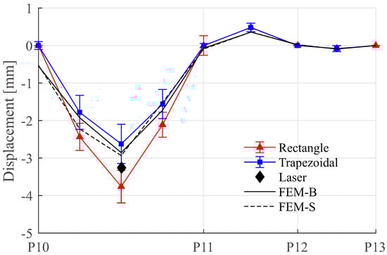The second static test consists of the application of a concentrated load of 42.7 kN at a half span between P10 and P11 on the south-east leg. The load is applied as a single concentrated nodal force in the B model and divided into two concentrated nodal loads in the S model along the same cross-section. The displacements obtained along the south-east leg are compared with those estimated in [], through double integration of the curvature according to both rectangular and trapezoidal rules, and with that measured by a laser. Figure 11 shows that the numerical predictions obtained with both the B and S models shows an excellent agreement with experimental results, i.e., they fall within the error limits (see errorbars in Figure 11) due to the numerical integration and the mechanical strain measurement.